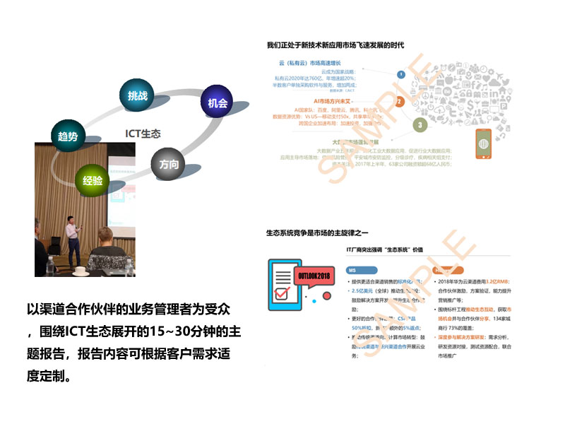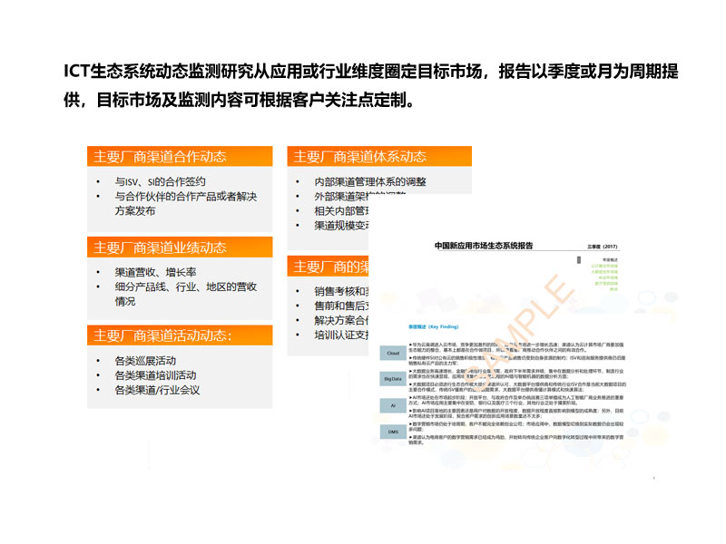 G-ECO持續關注著生態玩家群體的業務生命周期、新應用業務現狀、基本ICT業態、重點ICT產品、重點合作品牌、業績周期變化、業務結構變化、業務驅動力變化、生態系統評價、生態合作訴求等信息,并藉此建立對ICT市場的整體認知。據此,我們為客戶提供如下服務: